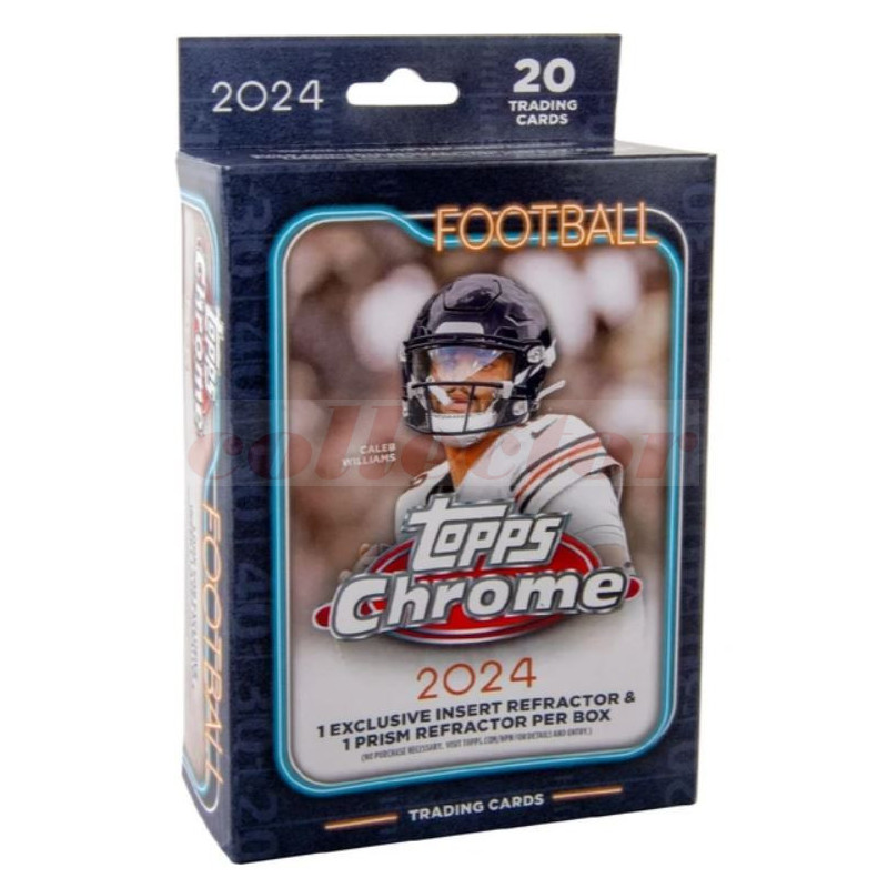 Topps 2024 NFL Chrome Football Hanger Box obsahuje 20 karet. Hledejte exkluzivní inserty a paralelky Chrome!